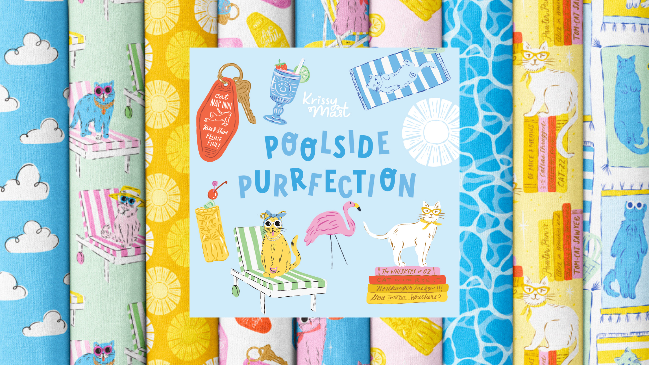 POOLSIDE PURRFECTION || Retro Meowtel | Multi || Organic Cotton Quilting Fabric