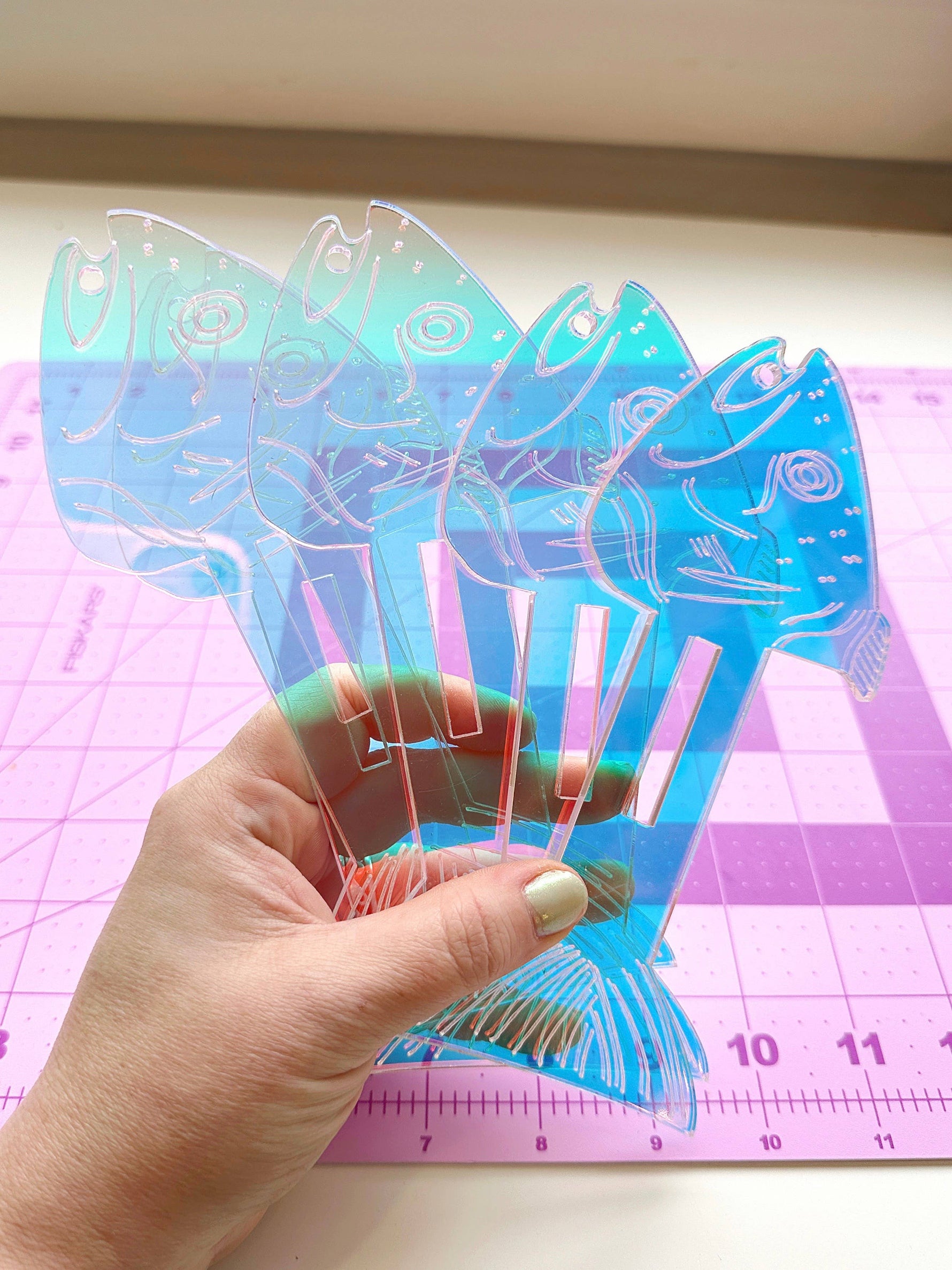 Fresh caught binding! Keep your quilt binding tidy with a friendly fish. Holds enough binding for a queen size quilt! Measures approximately 6.5 by 3.25 inches. Made from iridescent 3 mm acrylic.